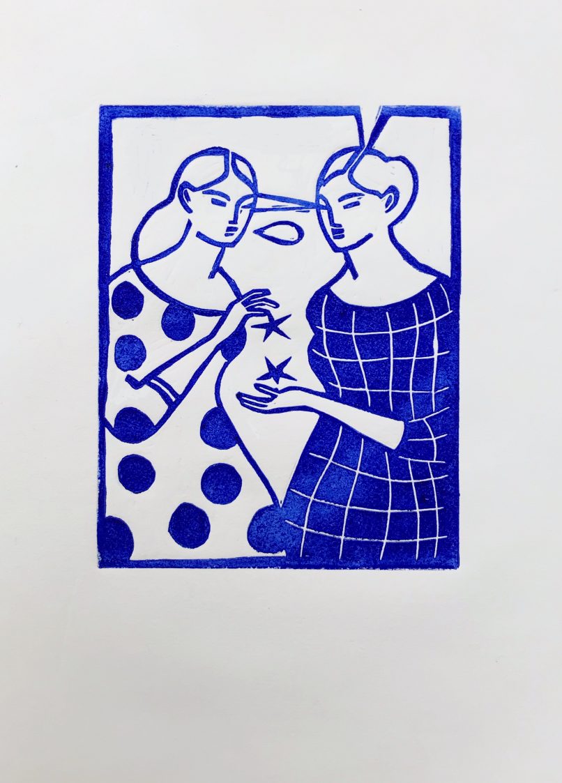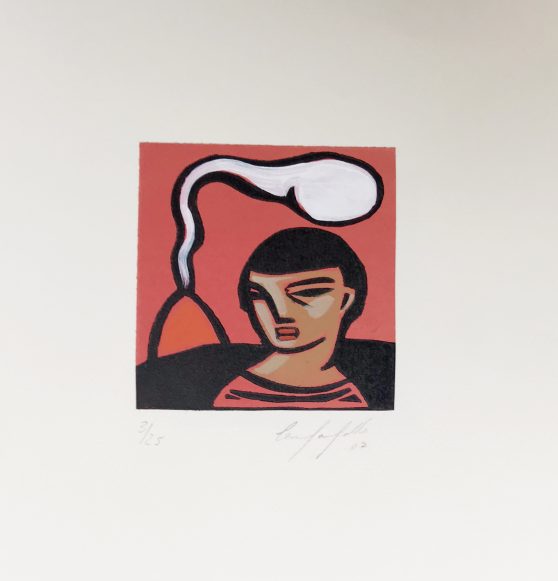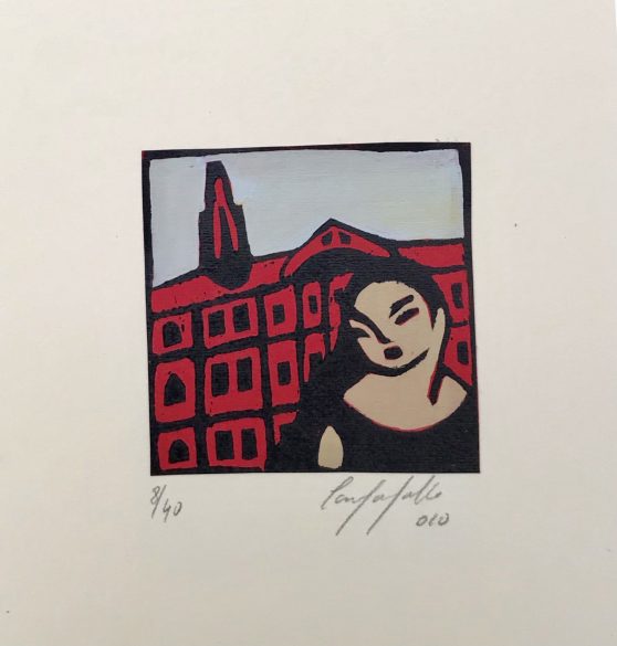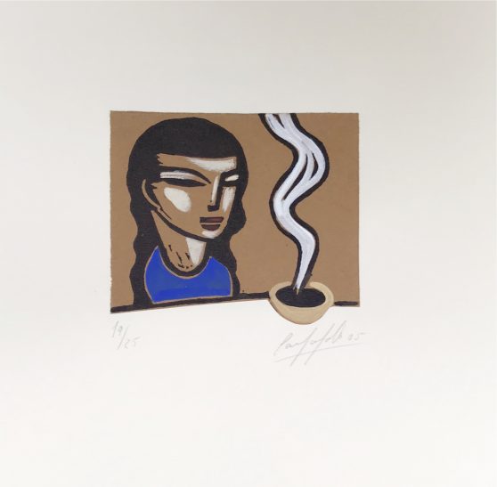 Café con leche..10 x 10 cm. Xilografía sobre papel de color, coloreada a mano. 55€ ( sin marco 45)