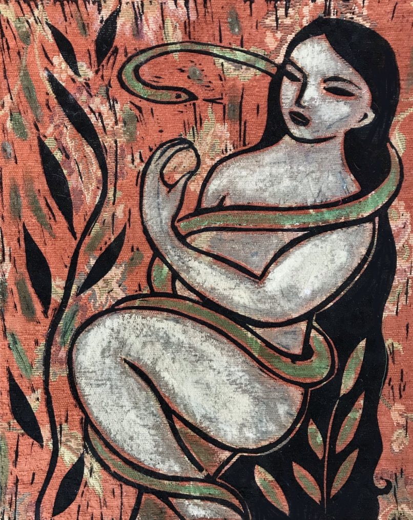 Eva..30 x 40 cm. Xilografía sobre tela estampada, coloreada a mano. 150 € (sin marco 120)